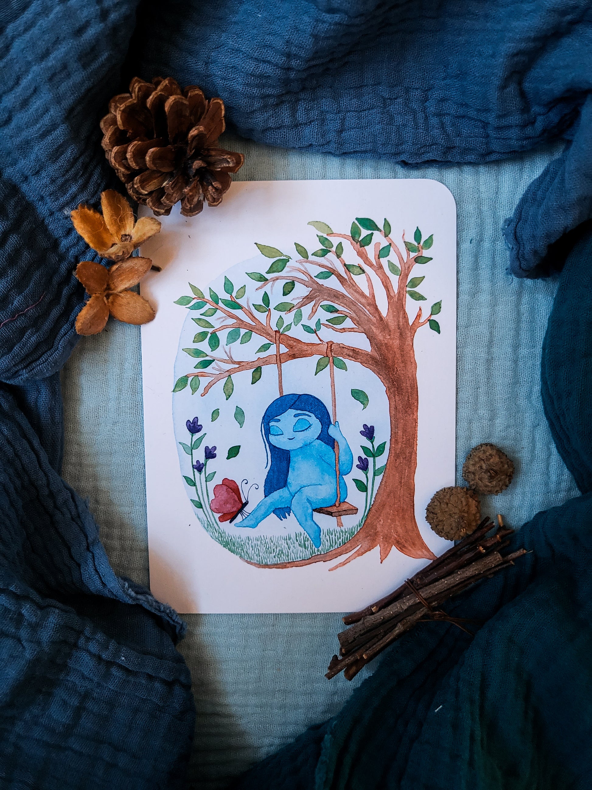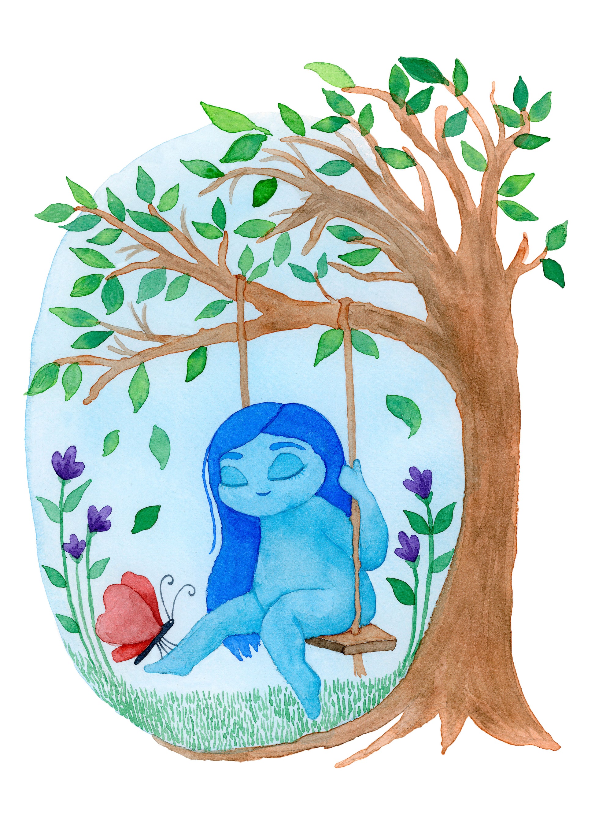 Håndmalet illustration af et månebarn der gynger i et træ med lille sommerfugl. 30x40 cm.